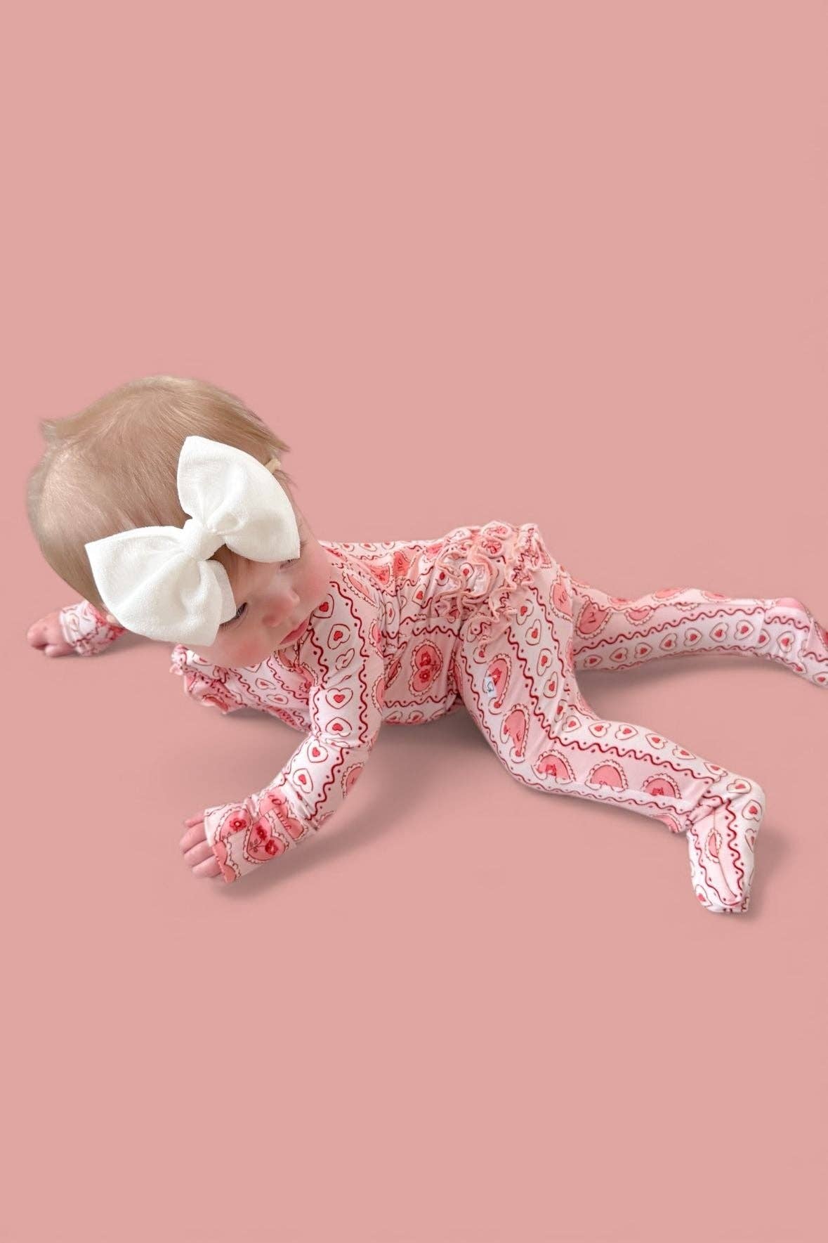 Your little sweetheart will be ready for hugs, kisses, and all the “Be Mine” moments in our Candy Hearts Dream Ruffle Romper! This adorable romper features rows of pastel candy hearts printed with sweet sayings like “Love,” “XOXO,” and “Hug Me,” plus dainty ruffle details for an extra touch of charm. Crafted from buttery-soft bamboo, it’s breathable, stretchy, and gentle on sensitive skin—perfect for day or night.