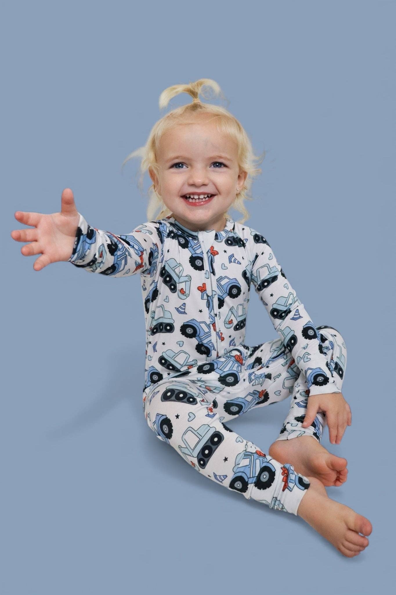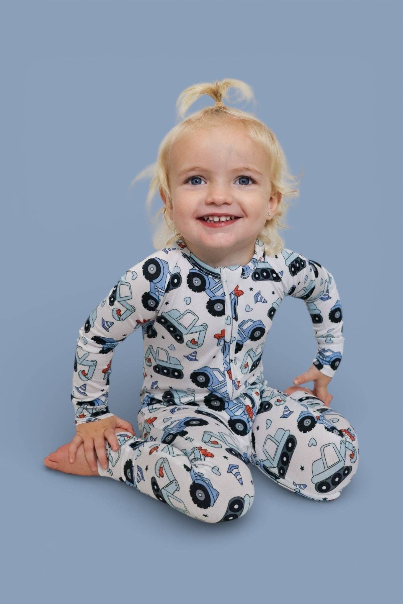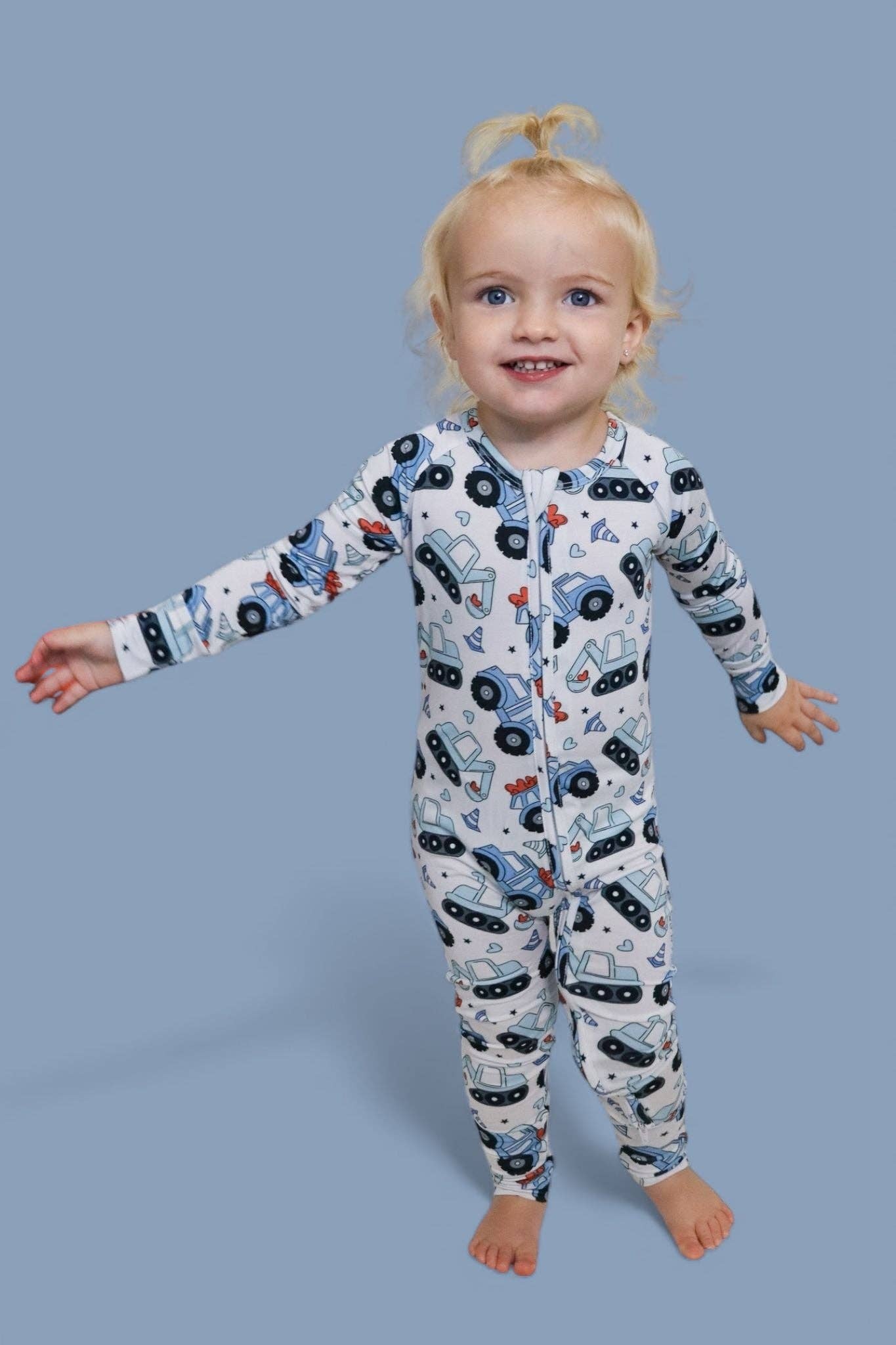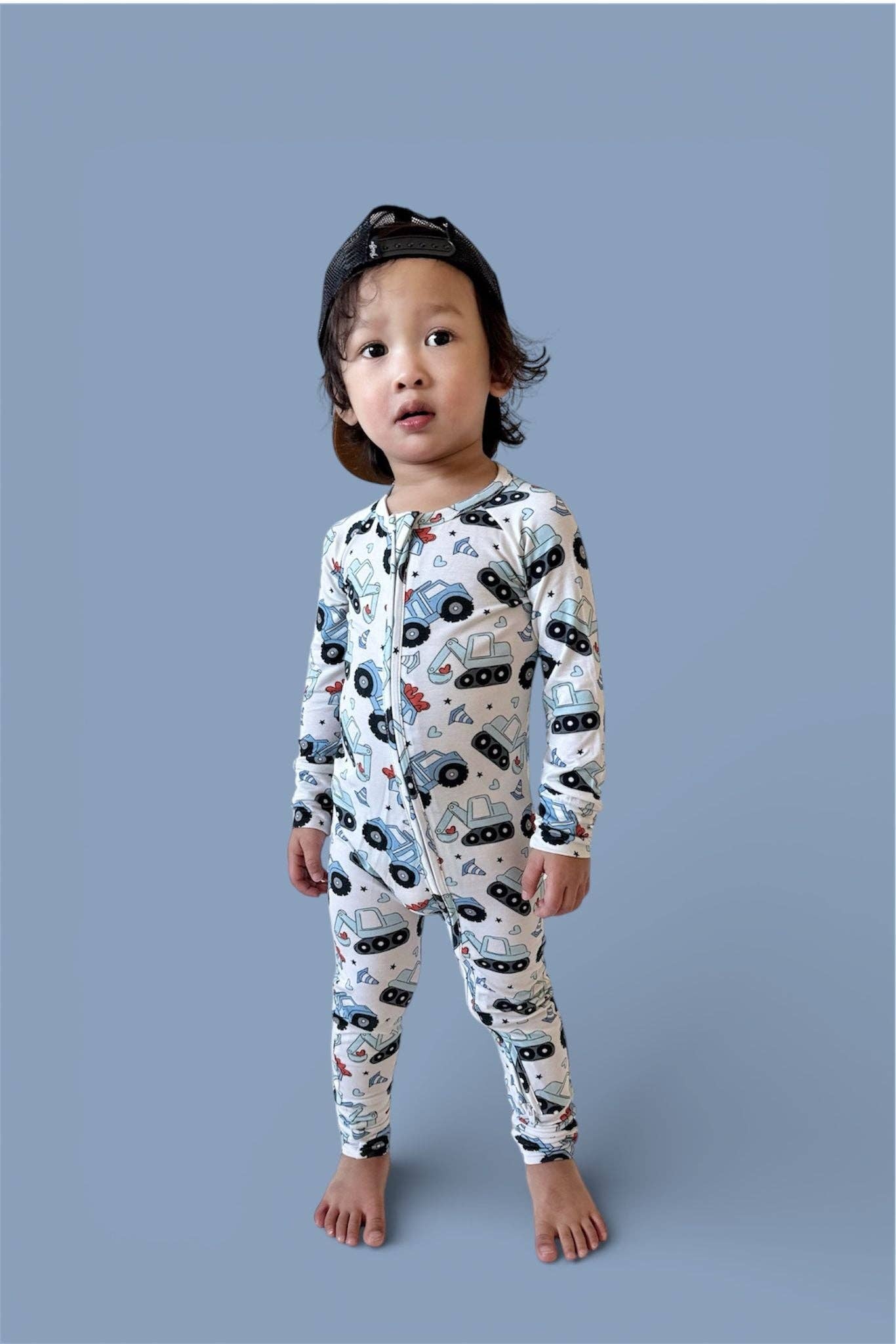 Building cozy dreams one snuggle at a time! The Love Under Construction Dream Romper features a fun all-over print of dump trucks, excavators, and hearts in shades of blue, gray, and pops of orange. Crafted from our signature buttery-soft bamboo fabric, itโs breathable, stretchy, and perfect for little ones on the move. A two-way zipper makes diaper changes quick and easy for parents too.