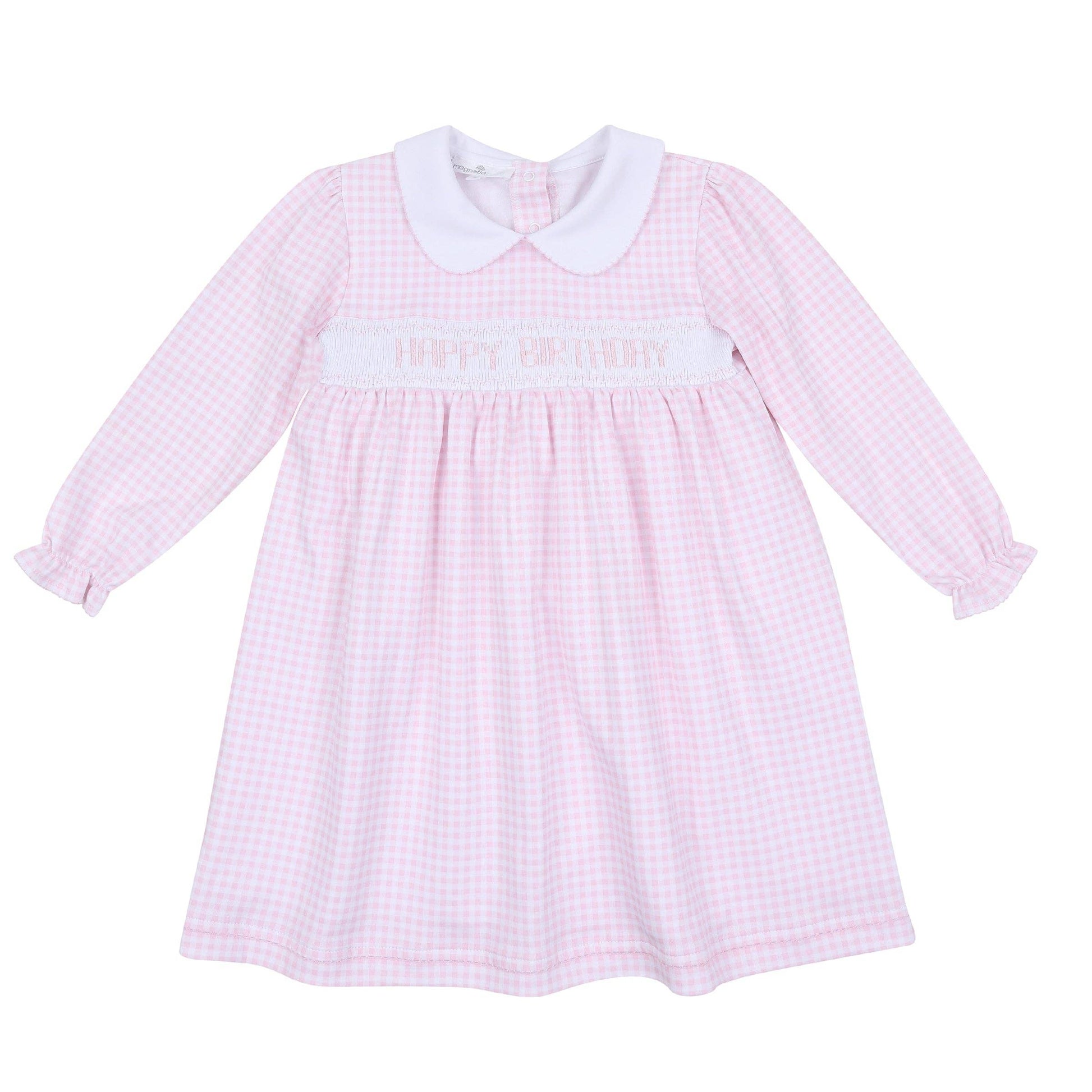 An ideal outfit for a birthday celebration, this long sleeve dress is made to be treasured. Crafted from luxurious pink gingham Pima Cotton, it features "HAPPY BIRTHDAY" hand embroidery on a smocked panel and a delicate peter pan collar. The design is paired with a matching diaper cover to complete this classic and comfortable ensemble.