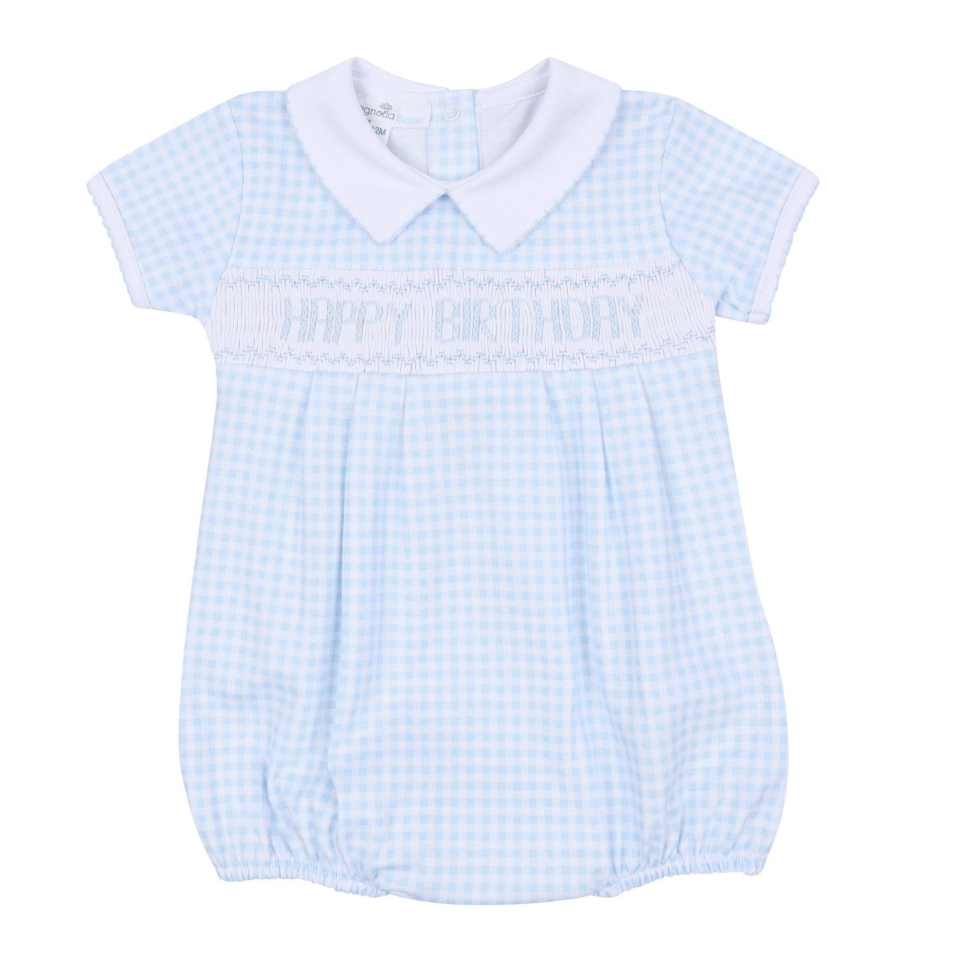 Celebrate their special day with this precious short sleeve bubble. Crafted from luxurious Pima Cotton in a charming light blue gingham print, it features a hand-embroidered smocked panel that says "HAPPY BIRTHDAY" in blue. The sweet silhouette is completed by a peter pan collar with delicate blue picot trim and convenient snaps for easy changes.