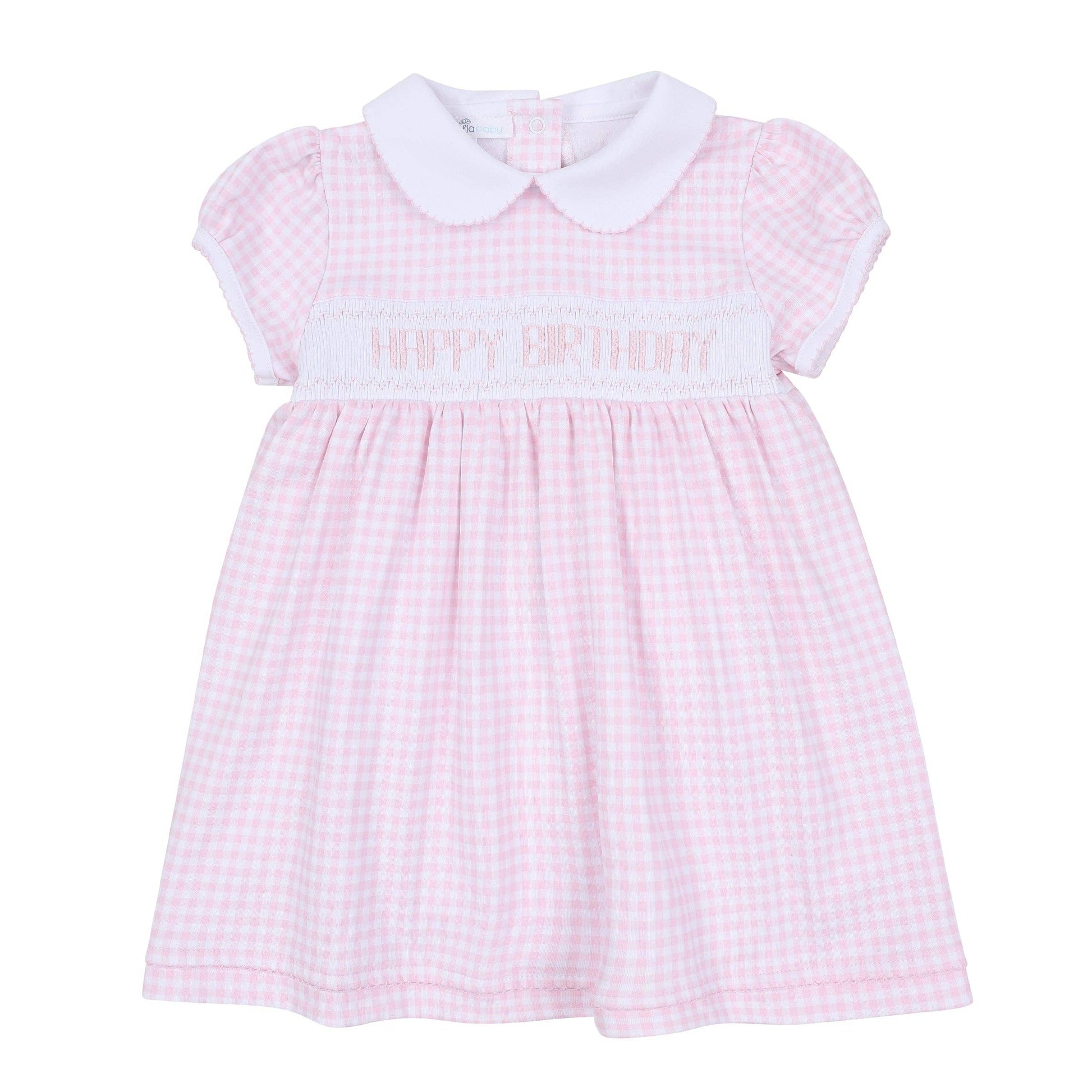 This delightful short sleeve dress is a perfect choice for their special day. Crafted from luxurious pink gingham Pima Cotton, it features "HAPPY BIRTHDAY" hand embroidery on a smocked panel and a delicate peter pan collar. The sweet design comes with a matching diaper cover to create a truly memorable and classic look.