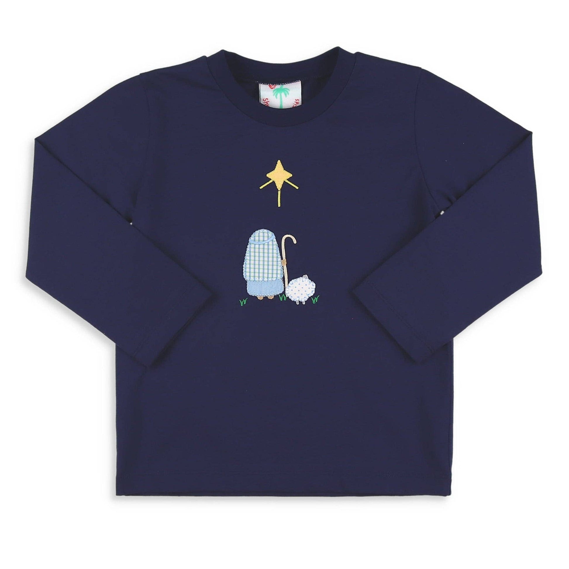 Featuring navy blue cotton knit fabric with a banded neckline, long sleeves, and an applique shepherd, in light blue and white gingham, tending his blue polka dot sheep, facing the star. Can pair with many of our Shrimp pants for a comfy and great look!