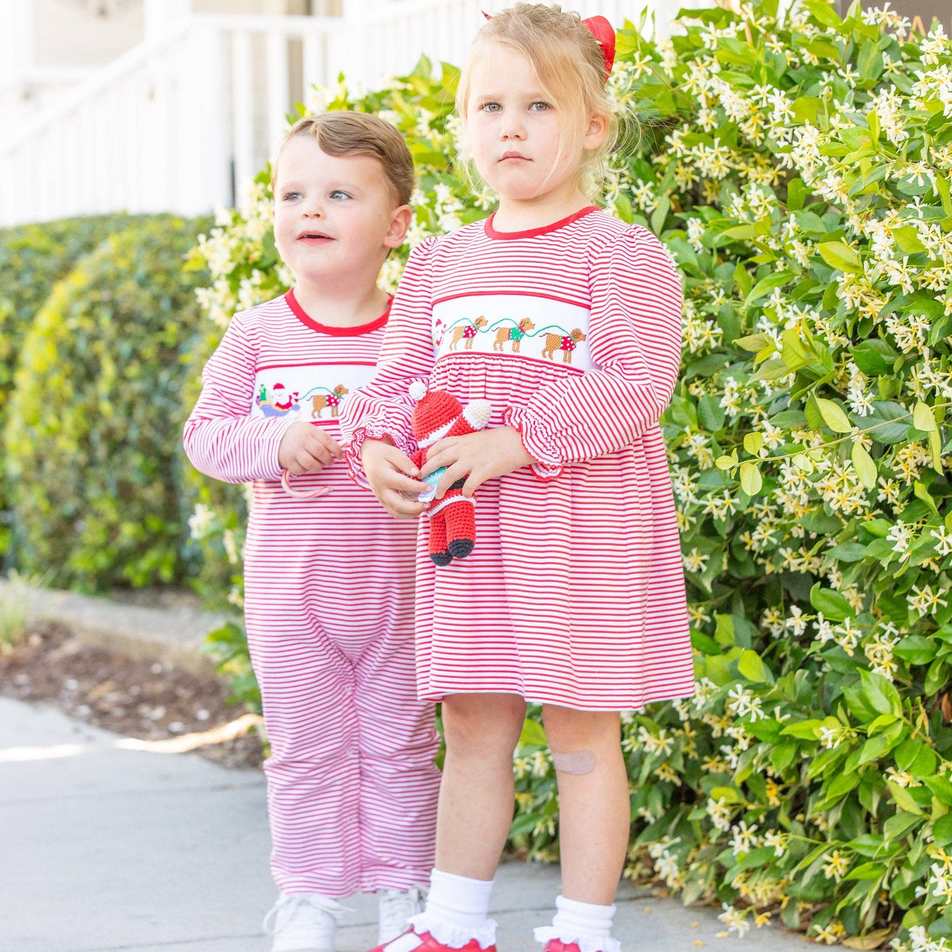 Does he recall the most famous reindeer of all? He probably does, but he surely will love this different take on Santa's sleigh in our jolly classic style, long sleeved hand-smocked Boys Smocked Romper-Santa Dogs by Shrimp and Grits Kids!