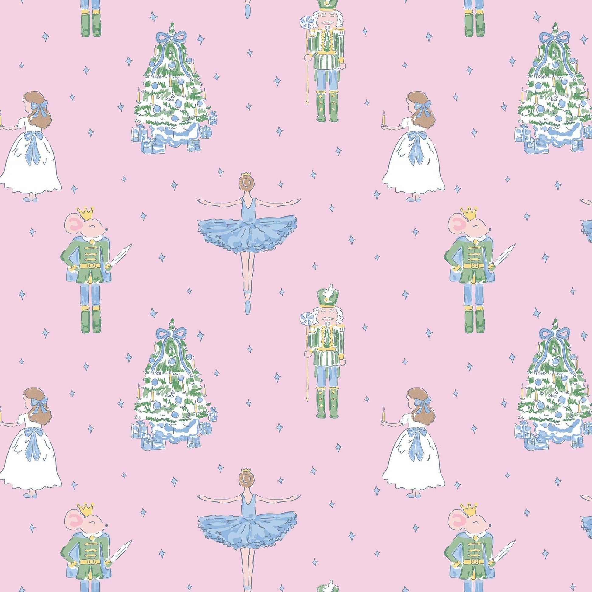 With all the characters of the Nutcracker, along with Christmas trees printed on soft pale pink bamboo fabric, the picot finished blue trim detail, and the blue bow and cuffs provide classic styling, while the convenient zipper and non-functioning back flap make nighttime changes easy.