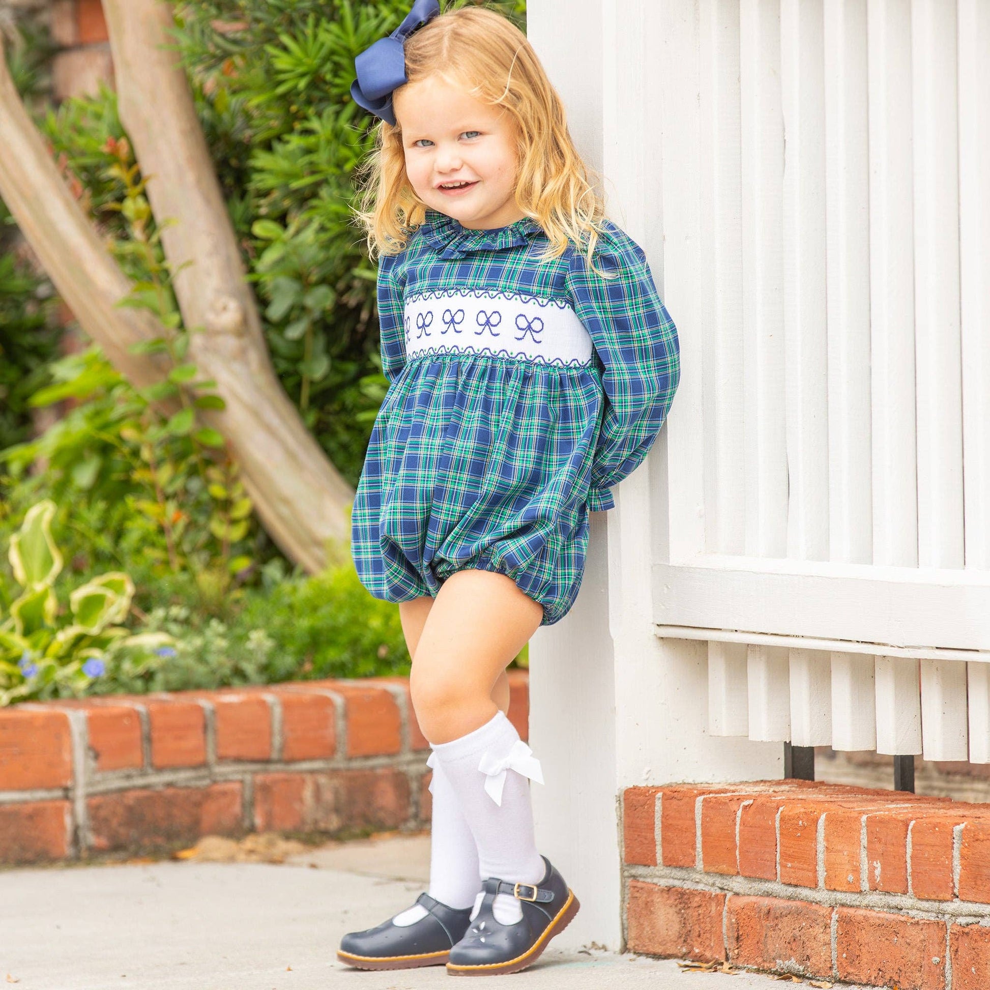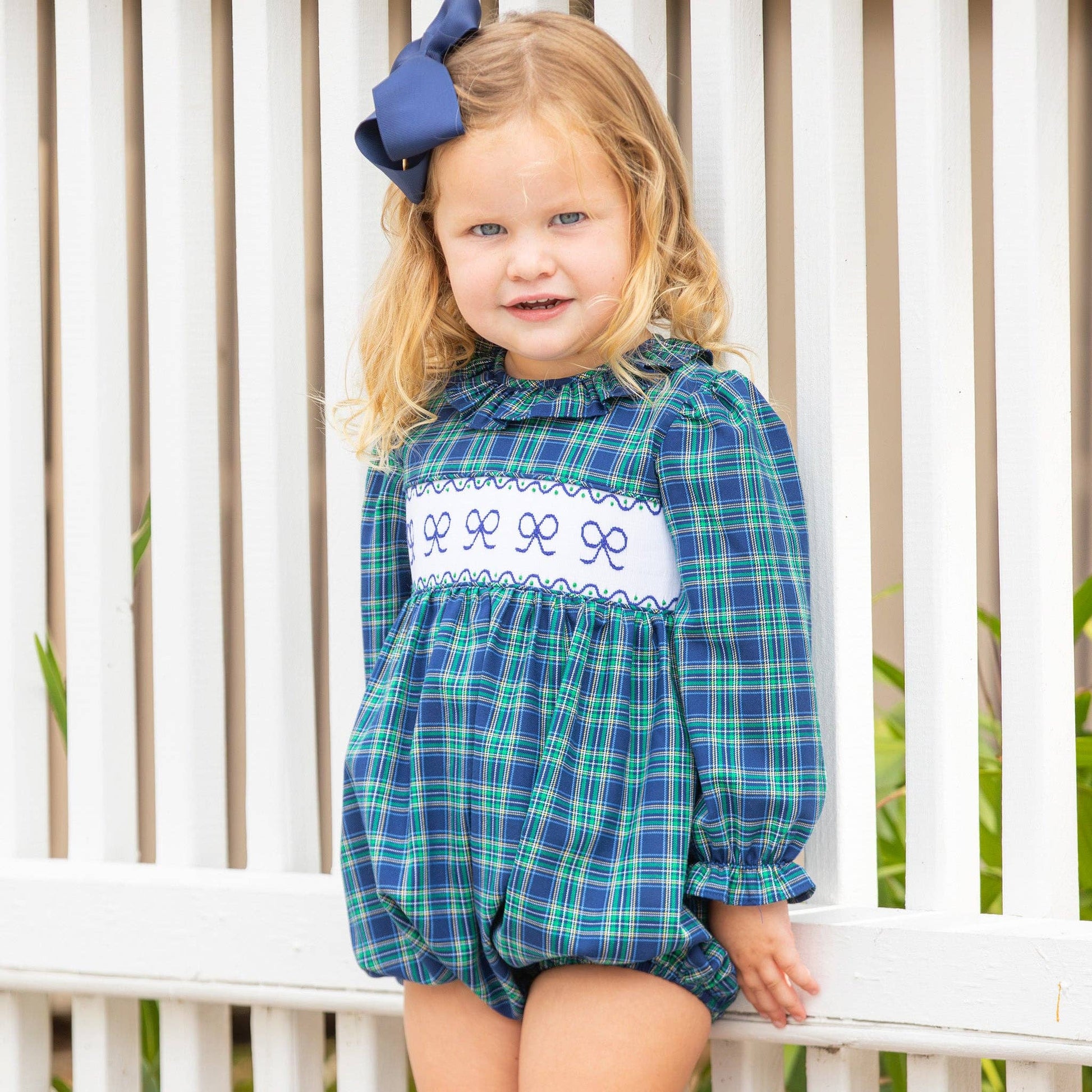 This vintage bubble features a blue, green, and white tartan plaid fabric, ruffle long sleeves, a ruffle collar and custom hand-smocking of navy bows on white across the chest. The navy corduroy piping above and below the smocking just makes this outfit even more special.